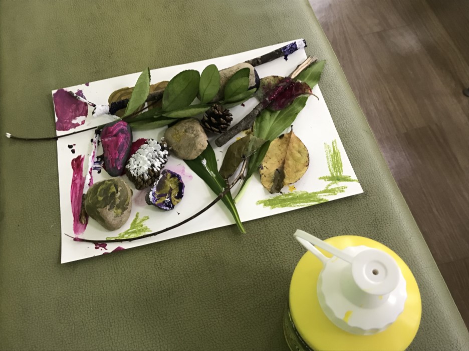 보린원 앞마당에서 아이와 함께 나뭇가지, 돌멩이, 나뭇잎, 솔방울과 같은 자연물을 줍고,