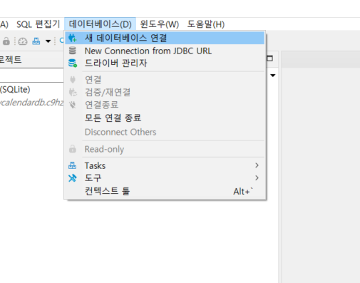DB 연결을 위해 상단 바의 데이터베이스 - 새 데이터베이스 연결로 들어간다.