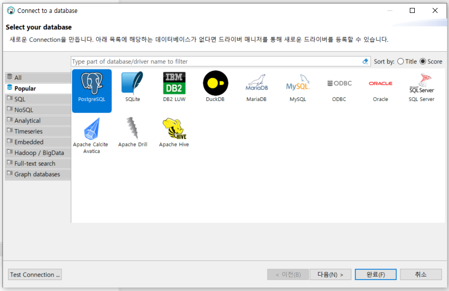 그럼 이렇게 간편하게 내가 만들거나 접속할 DB들이 나열된다. Popular에 있는 PostgreSQL을 클릭했다.