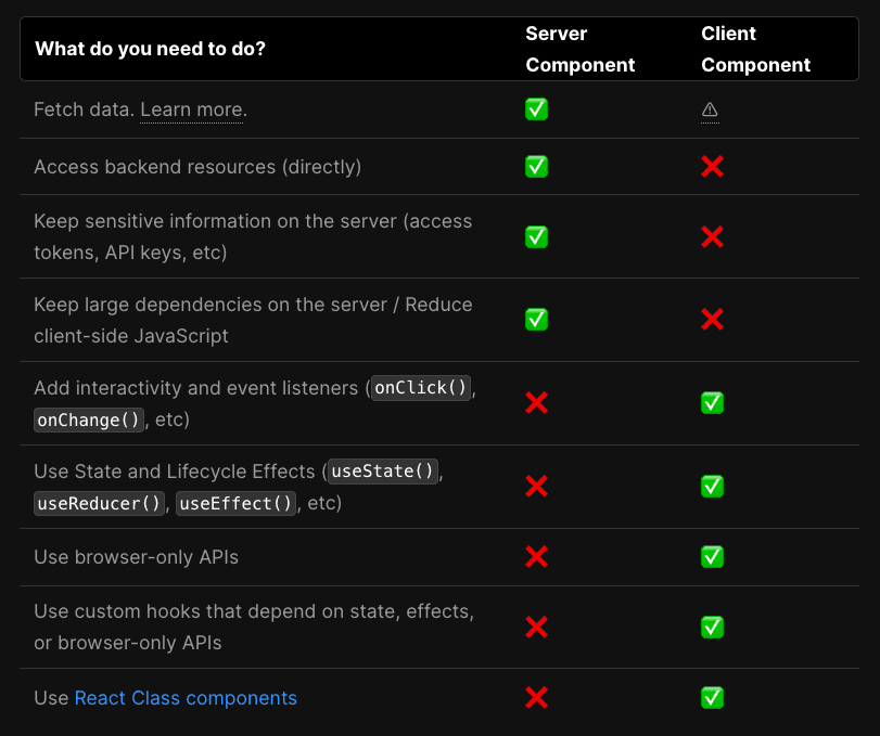 (app directory의 모든 컴포넌트들은 디폴트로 RSC(React Server Components)다. 클라이언트 컴포넌트는 파일 첫줄에 'use client'라고 입력하면 된다. 공식문서에서 각각 쓸 수 있는 경우를 잘 정리하고 있다. 예를 들어 클라이언트 컴포넌트에 검색 결과를 fetching하여 state에 저장하는 코드를 작성하고, 그것을 서버 컴포넌트에 interleave(끼워 넣다)하여 nested layout으로다가 필요한 부분만 재랜더링 하면 된다. 반면 서버 컴포넌트에서 useState 쓰면 에러를 뿜는다. 신박하다! RSC에 대해서도 좀 더 깊이 있게 정리해보자.)