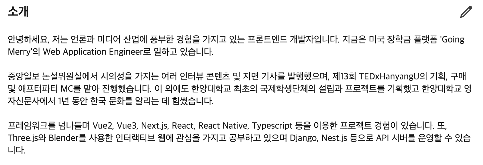 나를 조회한 사람이 이름과 사진 이후 처음 보게 되는 것은 바로 '소개'입니다. 나에 대해서 파악할 수 있는 가장 좋은 파트인만큼 곁가지는 빼고, 나의 강점과 중요한 이력을 담은 핵심적인 몇 줄로 구성해주세요. 또 이력이 변경됐을 경우 나의 최신 상태가 어떤지를 반영해 주기적으로 업데이트하는 것이 좋습니다.
