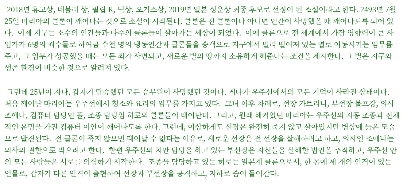 나는 SF랑 친한 편은 아니다. 과학의 영역에는 원체 자신감이 없기도 하고, 픽션보다는 논픽션 책을 보다 많이 읽어온 탓이다. 그래서 자발적으로 SF 도서를 빌려오는 적은 별로 없었다. SNS에서 '식스 웨이크'의 추천 글을 보고 읽어보았는데, 후회하지 않을 만한 선택이었다.