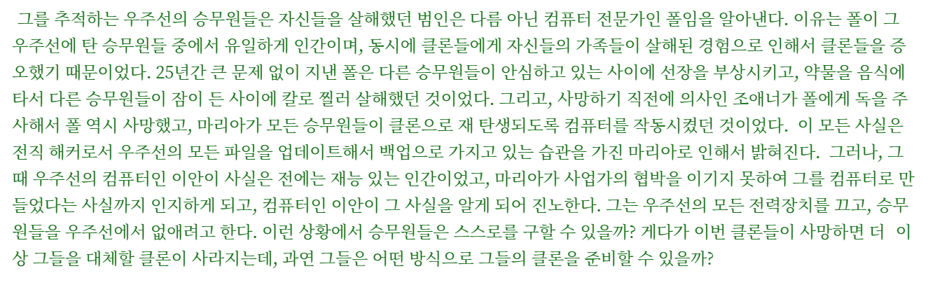 사실 SF는 이제 판타지보다는 현실에 가까이 놓인 장르라고 생각한다. Scientific Fiction인데 그게 무슨 말인가 싶지만, '식스 웨이크'가 중점적으로 다루고 있는 인간 복제, 인공지능 등은 우리가 앞서서 윤리적 고민들을 하지 않으면 안되는 '미래의 현실'로 다가왔기 때문이다. 한국에서 큰 논란이 된 '이루다'에 관한 데이터 윤리 논쟁은 그 시작점 중 하나라고 할 수 있을 것이다.
