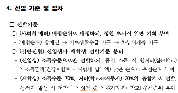 마지막으로 선발 기준 및 절차입니다. 포함되는 요소들은 1. 소득수준 2. 지원 당시 주소지와 대학교 간의 거리 3. 재학생의 경우 동점자 처리할 시에는 성적이 있습니다. 그러나 소득수준이 가장 결정적인 요인이 되고 있습니다.