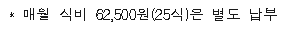 한 가지 더, 매월 25식 제공되는 식비를 62,500원 지불하셔야 합니다. 한 끼당 2500원이라니... 아직도 믿기지가 않아요 ㅎㅎ 사실 제가 한국마사회장학관에 거주하면서 가장 만족했던 부분인데요, 사진이 없는 것이 너무 아쉽지만... 영양사 선생님께서 충분한 예산으로 늘 신경써서 식단을 짜주신다는 느낌이 들었습니다! (25식을 모두 소진하면, 10식 단위로 식권을 구입 가능하다고 하네요!)