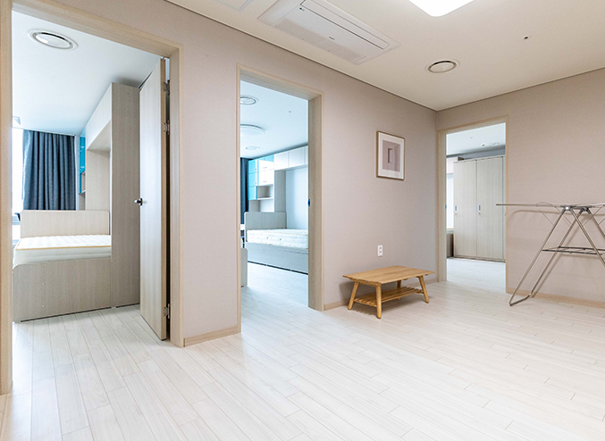 방마다 충분한 수납공간이 마련되어 있으며, 옷장 역시 방과 거실에 하나씩 있어 총 두 개의 옷장을 사용하실 수 있어요.