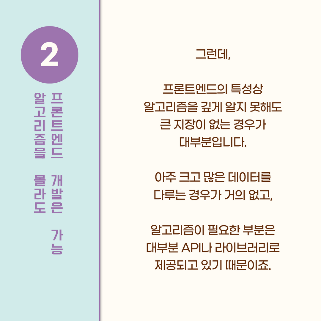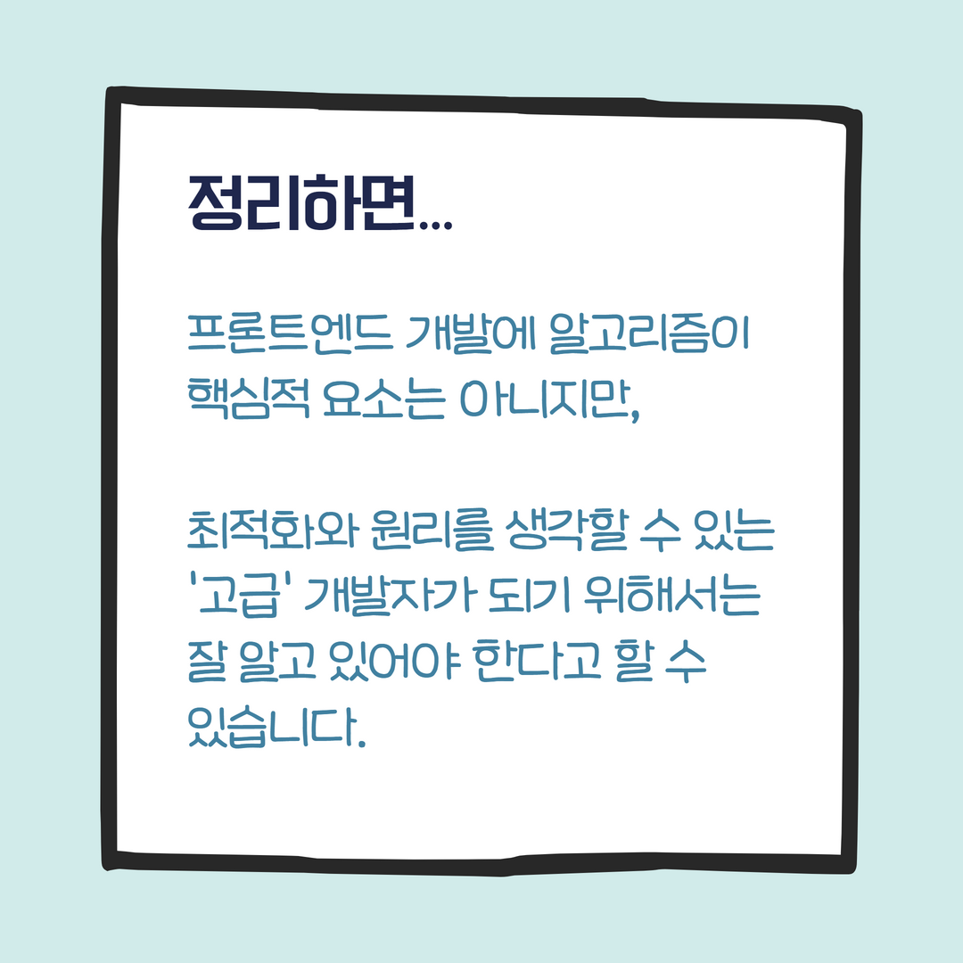 그런데, 프론트엔드의 특성상 알고리즘을 깊에 알지 못해도 큰 지장이 없는 경우가 대부분입니다.