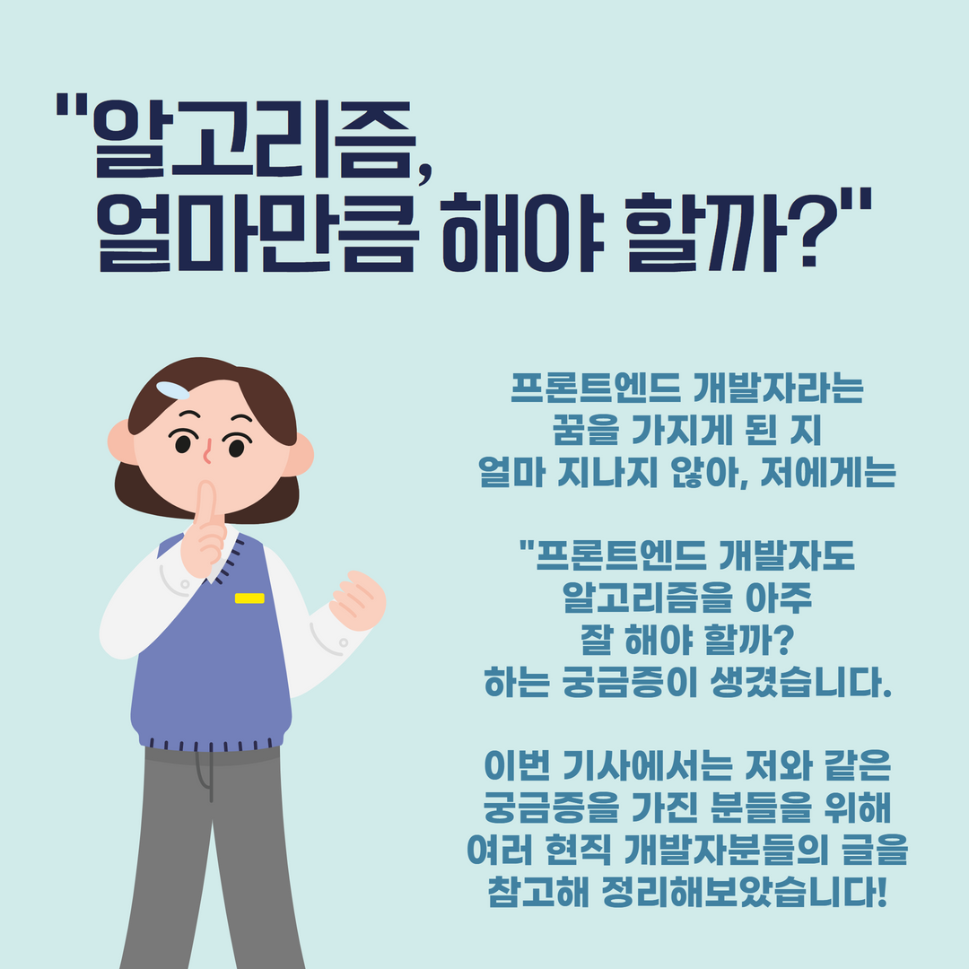 프론트엔드 개발자라는 꿈을 가지게 된 지 얼마 지나지 않아, 저에게는 "프론트엔드 개발자도 알고리즘을 아주 잘 해야 할까?" 하는 궁금증이 생겼습니다.