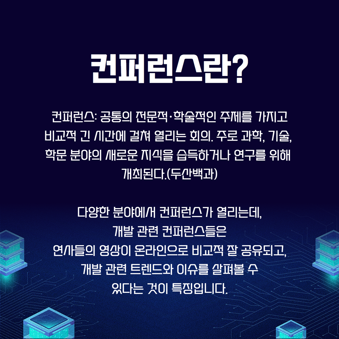 다양한 분야에서 컨퍼런스가 열리는데, 개발 관련 컨퍼런스들은 연사들의 영상이 온라인으로 비교적 잘 공유되고, 개발 관련 트렌드와 이슈를 살펴볼 수 있다는 것이 특징입니다.