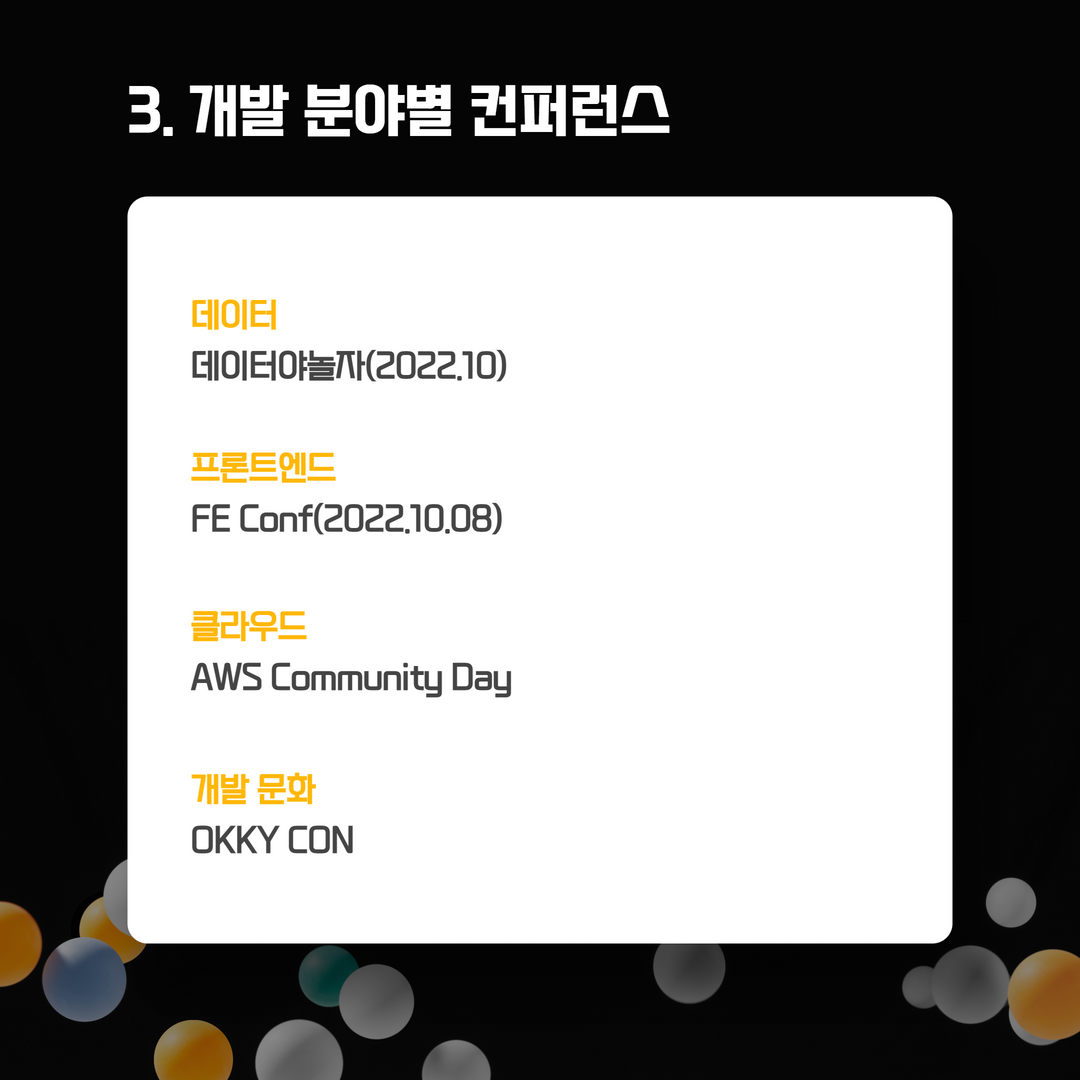 : 이 외에도 데이터, 프론트엔드, 개발 문화, 클라우드 등 개발 관련 다양한 분야의 컨퍼런스들이 있습니다.