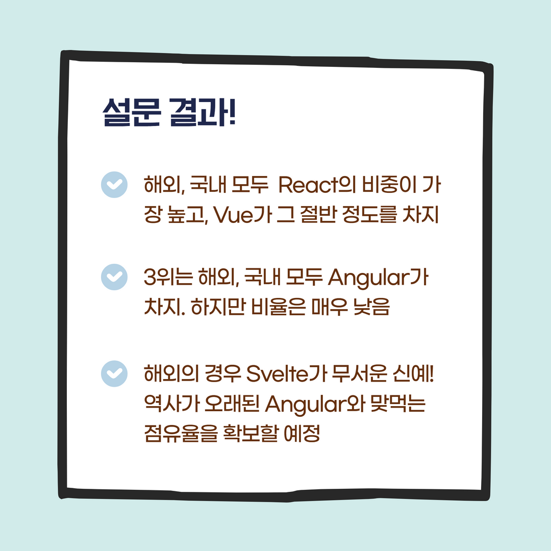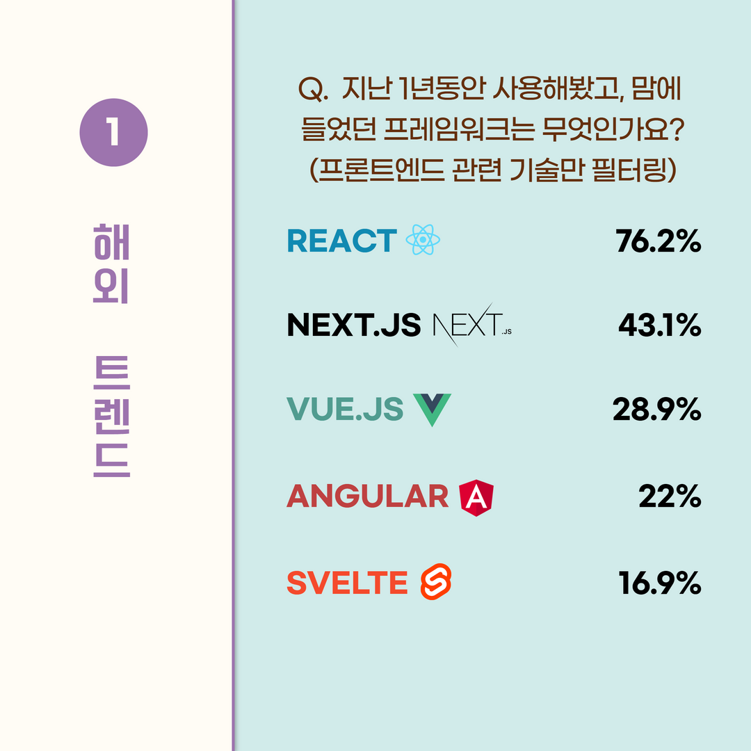 - 해외, 국내 모두 React의 비중이 가장 높고, Vue가 그 절반 정도를 차지