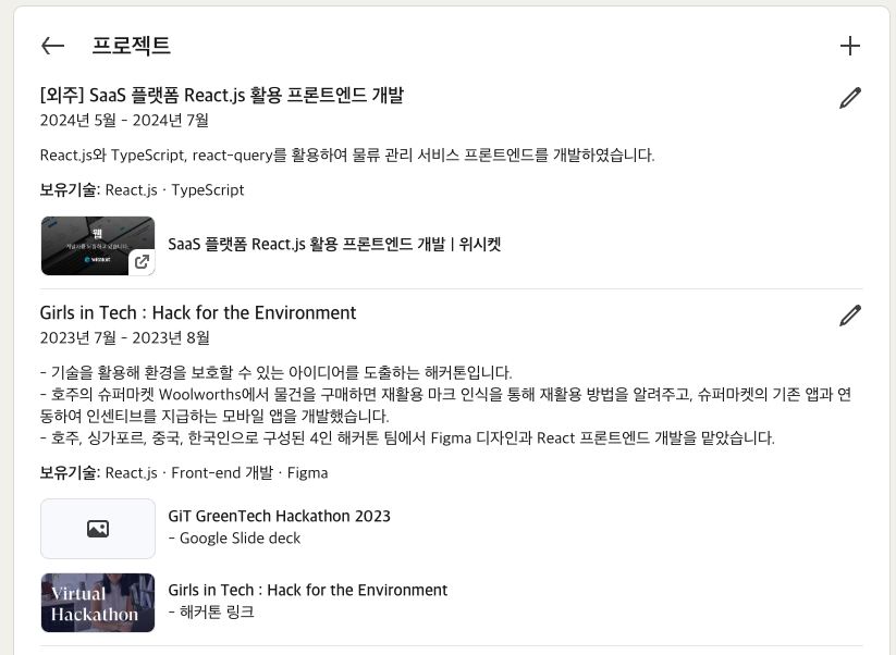 링크드인에는 또 '프로젝트'라는 섹션이 있는데요, 일부 직군에게는 별로 중요하지 않는 부분일 수 있지만, 사이드 프로젝트로 자신을 증명하기도 하는 개발자들에게는 잘 관리하면 좋을 부분입니다. 개인 사이드 프로젝트뿐만 아니라 해커톤, 외주, 대회 등 모든 종류의 프로젝트를 등록해서 나의 이력을 풍성하게 만들어 보세요. 저는 위 사진처럼 회사를 다니면서 진행한 해커톤과 외주 프로젝트를 추가했습니다.