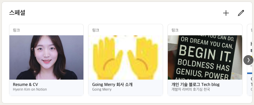 앞서 살펴 본 '소개' 섹션 바로 아래에는 '스페셜' 섹션이 있는데요, 다양한 링크를 썸네일과 함께 슬라이드쇼 형식으로 표현할 수 있습니다. 이력서, GitHub 링크, 블로그 등 링크드인의 다른 섹션에 싣기에는 애매하지만, 나에 대해서 잘 표현할 수 있는 자료들을 중요한 순서대로 올려 놓으면 좋습니다. 저는 국문/영문 이력서, 영문 커버레터, 재직 중인 회사 소개, 기술 블로그 등을 스페셜 섹션에 올려 놓았습니다. 번외로 해외 취업 시에는 Resume와 Cover Letter가 요구되는 경우가 많아 준비해 놓는 것이 좋습니다.