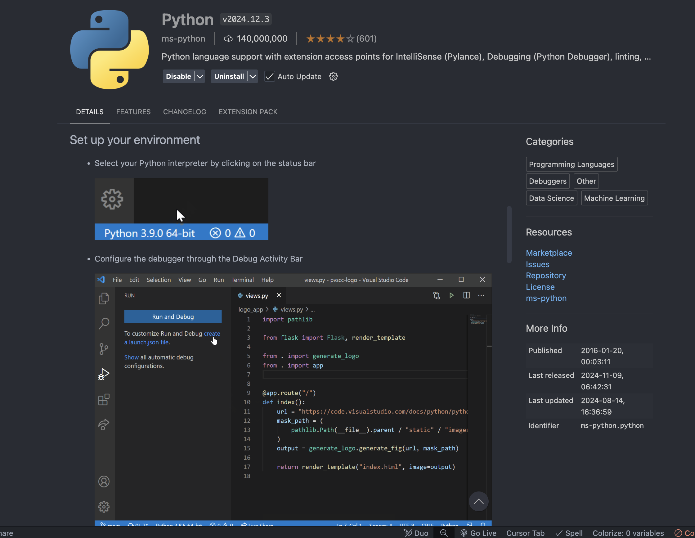 이제 실제 개발을 위해 VSCode로 넘어가서는 전부 GUI를 사용했다. 우선 VSCode 확장 프로그램 목록에서 'Python'을 설치해 줬다.