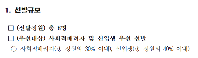 그리고 총 정원의 30%는 사회적배려자를, 총 정원의 40%는 신입생을 선발한다고 되어 있네요. 따라서 사회적배려 대상자 분들 그리고 특히 신입생이신 분들께 크게 유리한 조건이라고 할 수 있습니다.