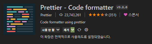 settings.json 설정 방법이 변경 되어서 수정 필요 eslint-config-prettier 는 eslint가 Prettier과의 충돌 되는 부분을 비활성화해주는 config이다. .eslintrc.json eslint-plugin-prettier는 Prett